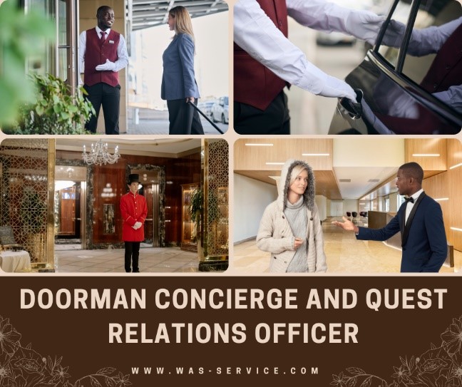- พนักงานเปิดประตู (Doorman) มีหน้าที่หลักคือ ช่วยแขกเปิดประตูรถยนต์ขณะนำรถเข้ามาจอดที่ประตูใหญ่ของโรงแรม ซึ่งอาจจะรวมถึงการเปิดประตูโรงแรมขณะแขกกำลังจะเดินเข้ามาก็ได้